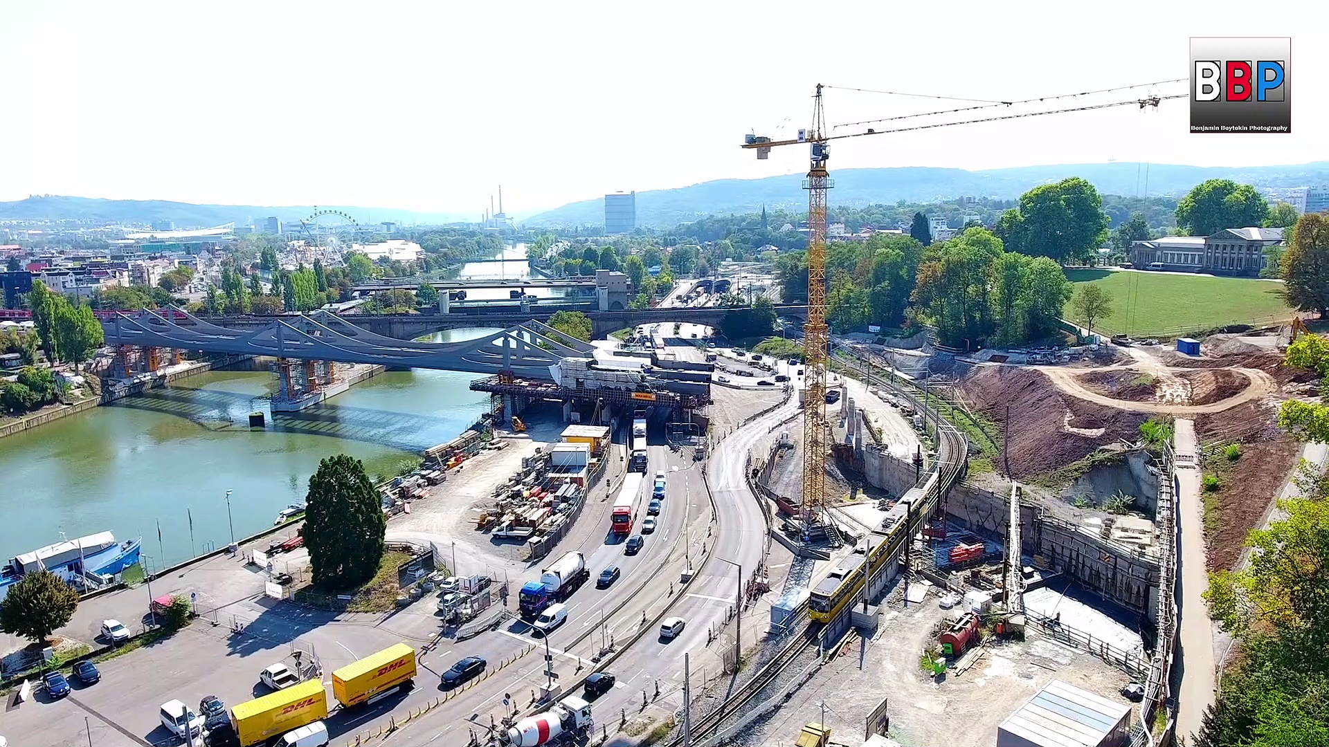 Via drone and from ground - tak a view on Europe's largest railway construction site: Stuttgart 21, bridge over river Neckar / Neckarbrücke, Stuttgart, Germany, 20.09.2018.<br /><br />https://en.wikipedia.org/wiki/Stuttgart_21<br />http://www.bahnprojekt-stuttgart-ulm.de/projekt/stuttgart-filder-s21/stuttgart/zufuehrung-feuerbach-und-bad-cannstatt//