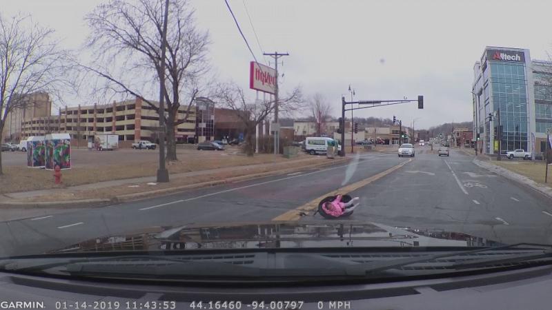 Chad Cheddar Mock, Autofahrer in Mankato, Minnesota, bekam einen Schock, als er der auf einer viel befahrenen Straße um eine Ecke bog: Da lag ein Kind, festgeschnallt in einem Auto-Kindersitz