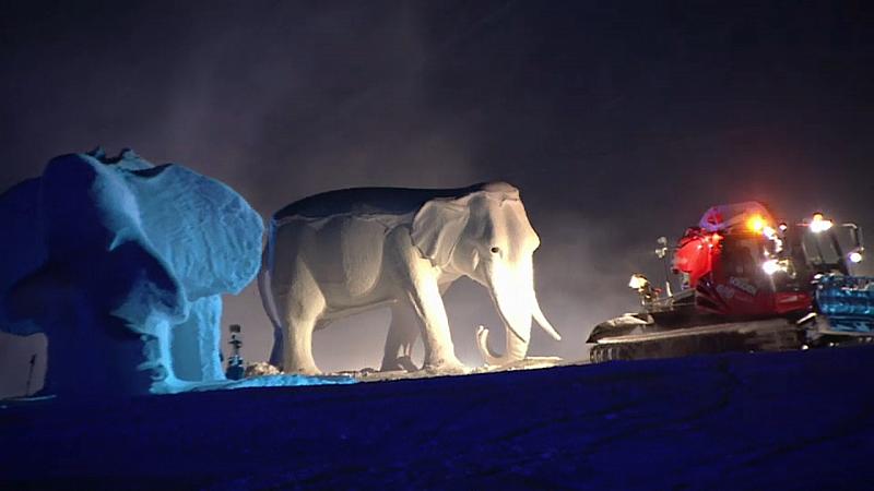 Im Tiroler Wintersportort Sölden nehmen Pistenraupen, Fallschirmspringer, Tänzer und Skifahrer an dem Riesenspektakel teil.