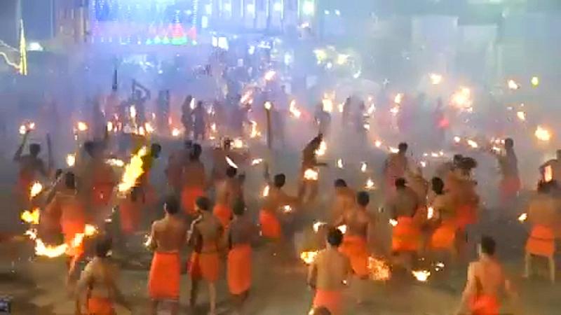 Im indischen Bundesstaat Karnataka haben Hindus ein für empfindsame Naturen brandgefährliches Feuerfest zelebriert. Ein wichtiger Bestandteil sind angedeutete Kampfhandlungen, bei denen sich die Kontrahenten mit brennenden Palmwedeln bewerfen.