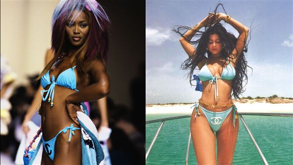 Die 21-jährige Kardashian-Schwester zeigte sich im Urlaub in einem Bikini, den das 49-jährige Topmodel bereits vor ihrer Geburt auf dem Laufsteg präsentierte. Wem steht der Zweiteiler besser?