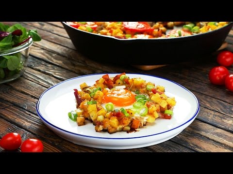 Dafür brauchst du:<br />5 mittelgroße Kartoffeln<br />Pflanzenöl zum Braten<br />Salz und Pfeffer<br />100 g gewürfelten Bacon<br />1 gewürfelte Zwiebel<br />1 gehackte Knoblauchzehe<br />3 Eier<br />1 Tomate, in Scheiben<br />50 g Frühlingslauch, in Ringen<br /><br />So geht es:<br />Schäle die Kartoffeln und schneide sie in kleine Würfel. Erhitze dann etwas Öl in einer Pfanne, gib die Kartoffelwürfel hinzu und würze diese mit Salz und Pfeffer.<br />Ist etwas Garzeit vergangen, füge Bacon, Zwiebel und Knoblauch hinzu und brate alle Zutaten gut an.<br />Schaffe drei kleine Mulden in der Pfanne, in die du die aufgeschlagenen Eier hineingleiten lässt. Gib Tomatenscheiben auf die Pfanne und brate die Zutaten geschlossen fünf Minuten weiter. Garniert wird die Mahlzeit mit Frühlingslauch.<br /><br />Sieh dir den ganzen Artikel über diesen Link an: http://www.leckerschmecker.me/pfannengericht-deluxe/?&ref=yt