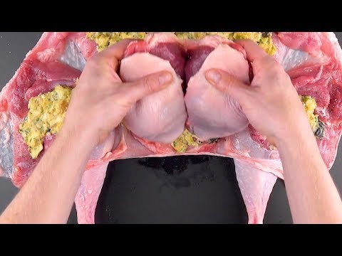 Mische 5 Eier mit 1 kg Toastbrot. Mit 3erlei Geflügel wird das dann der Hammer! <br /><br />Auf Pinterest merken: http://bit.ly/2EiA2DT<br />Lies hier alles nach: https://www.leckerschmecker.me/turducken/?&ref=yt<br /><br />Dafür brauchst du:<br /><br />Für die Füllung:<br /><br />100 g getrocknete Pflaumen<br />100 g getrocknete Aprikosen<br />100 g getrocknete Cranberrys<br />1000 g Toastbrot<br />5 Eier<br />30 g gehackte Petersilie<br />20 g gehackten Thymian<br />Salz, Pfeffer<br />100 g Butter<br />2 kleingewürfelte Zwiebeln<br />700 ml Milch<br /><br />Außerdem:<br /><br />1 Pute (6-8 kg)<br />1 Ente (2-3 kg)<br />1 Hähnchen (1-1,5 kg)<br />Rouladennadel<br />Küchengarn<br />Preiselbeeren zum Garnieren<br />Rotkohl (bei Bedarf als Beilage)<br /><br />So geht es:<br /><br />1.) Schneide das Toastbrot in grobe Stücke, am besten nimmst du dafür kein ganz frisches, sondern welches vom Vortag. Gib dann die ebenfalls in kleine Stücke geschnittenen Pflaumen sowie Aprikosen und die kleinen Cranberrys hinzu. Auch die fünf Eier, die Petersilie, der Thymian sowie Salz und Pfeffer kommen mit in die Schale.<br /><br />2.) Bringe die Butter in einem Topf zum Schmelzen und schwitze die Zwiebeln darin an, bis sie glasig sind. Gib dann die Milch hinzu, gieße die Flüssigkeit in die Schale mit dem Toastbrot und vermenge alles gut miteinander.<br /><br />3.) Schneide nun die Pute auf, entnimm Knochen sowie Innereien, würze sie ausgiebig mit Salz und Pfeffer und bestreiche sie mit der Füllung.<br /><br /><br />4.) Schneide nun auch die Ente auf, entbeine sie und nimm sie aus. Lege sie nun flach auf die Pute, würze auch sie ausgiebig mit Salz und Pfeffer und bestreiche auch sie mit der Füllung.<br /><br /><br />5.) Zuletzt schneidest du nun auch das Hähnchen auf, entbeinst es und nimmst es aus. Lege es flach auf die Ente, würze es ausgiebig mit Salz und Pfeffer und bestreiche es ebenfalls mit der Füllung.<br /><br /><br />6.) „Klappe“ die Pute nun vorsichtig an der Schnittstelle zusammen und nähe sie mit einer Rouladennadel und Küchengarn fest zusammen.<br /><br /><br />7.) Binde zum Schluss die Beine mit Küchengarn zusammen und brate den Turducken für vier Stunden bei 180 °C im Umluft-Modus.<br /><br /><br />Wenn du ihn schließlich aus dem Ofen holst, kannst du ihn mit Preiselbeeren und Rotkohl servieren, so bekommt der Braten eine zusätzlich fruchtige Note.<br /><br />Guten Appetit!