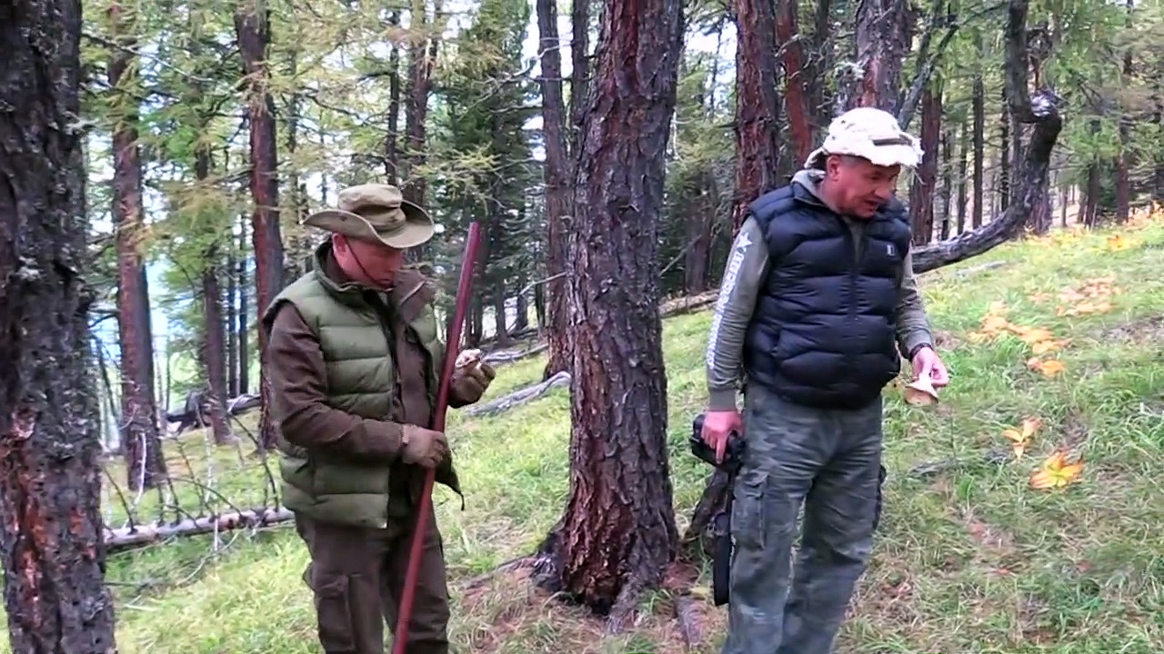 Russlands Präsident Wladimir Putin ist an seinem 67. Geburtstag vor atemberaubender Bergkulisse in Sibirien Pilze suchen gegangen. Begleitet wird er von Verteidigungsminister Schoigu.