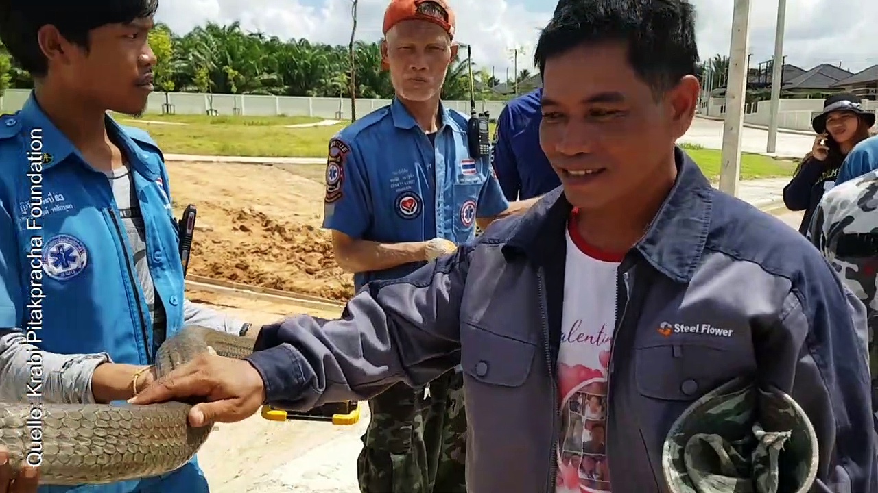 Eine vier Meter lange Königskobra schlängelte sich durch ein Abwassersystem in Thailand. Helfer fingen das giftige Tier mit bloßen Händen ein.