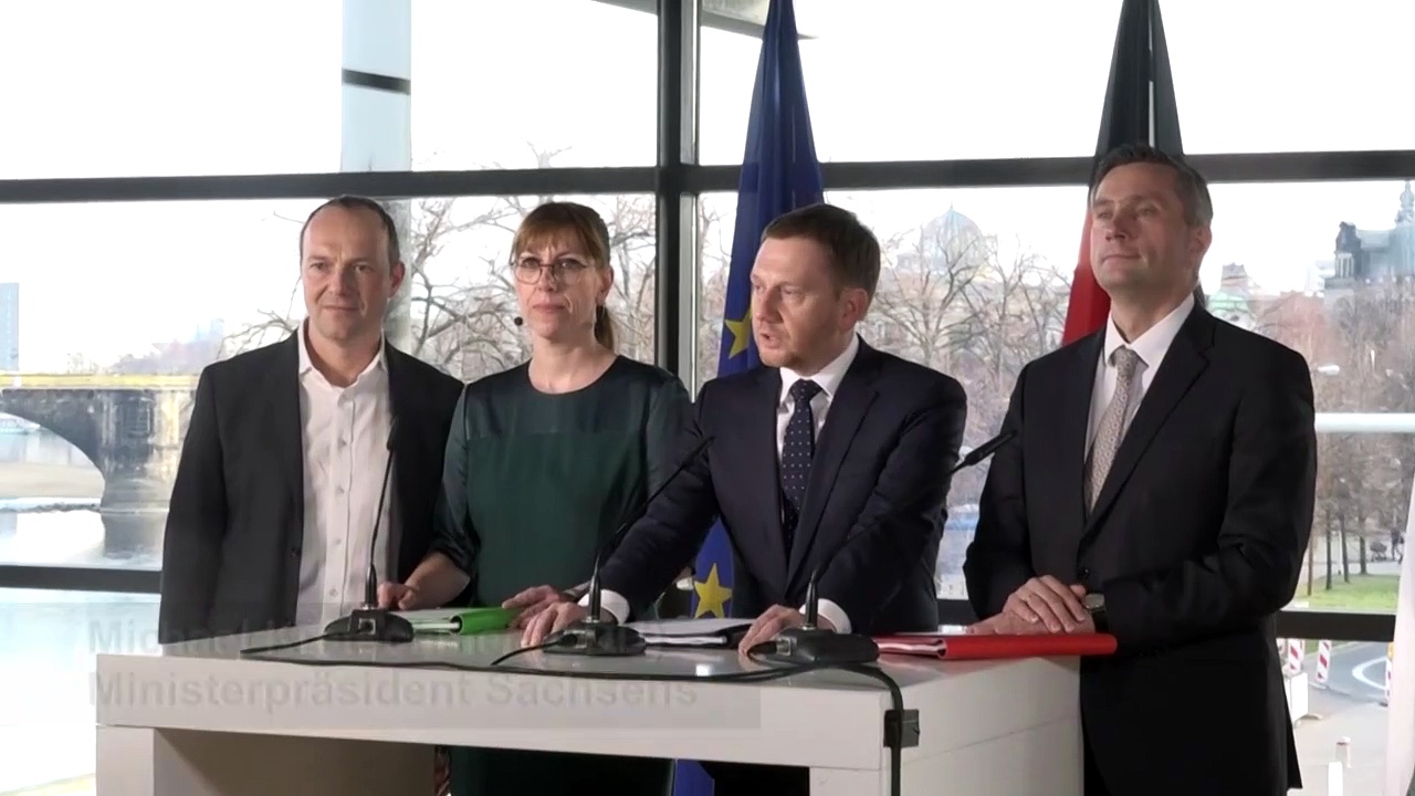 Drei Monate nach der Landtagswahl in Sachsen haben sich CDU, Grüne und SPD auf einen Koalitionsvertrag geeinigt. Es werde eine Regierung geben, "die stabil, in gegenseitigem Vertrauen, fünf Jahre für unser Land arbeiten will", sagte Ministerpräsident Michael Kretschmer (CDU) nach den abschließenden Beratungen in Dresden. IMAGES AND SOUNDBITES