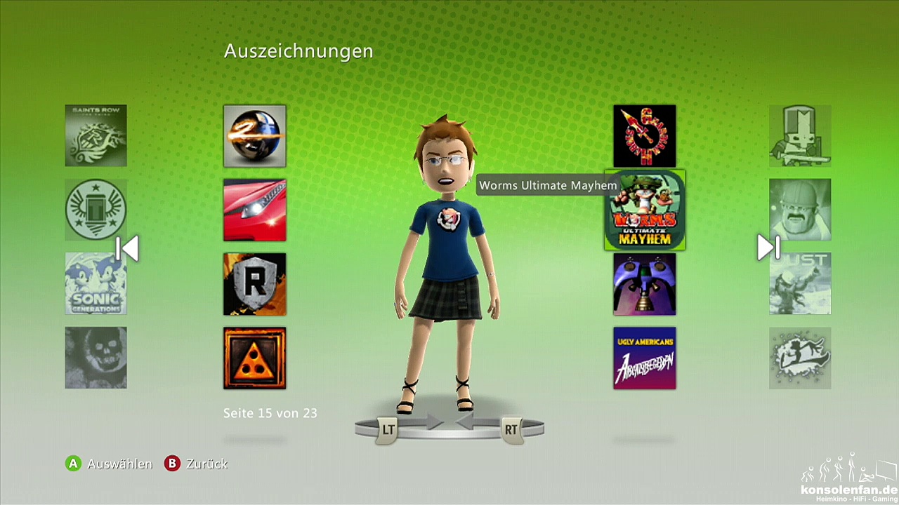 Seht in diesem Video alle von uns in dem Spiel freigespielten Avatar Awards. Nach Abschluss aller Aufgaben können wir für unser digitales Abbild mehrere Kleidungsstück aussuchen. <br /><br />Das Spiel Worms Ultimate Mayhem wurde auf der Xbox 360 am 22.06.2009 veröffentlicht und ist ein Actionspiel. Durch ein Update wurden die Avatar Awards hinzugefügt.<br /><br />In diesem Video seht ihr die Award Awards:<br /><br />- Splosion Man T-Shirt<br />- Big Science T-Shirt<br />- Splosion Man Sweatshirt<br />- Big Science Kleid<br /><br />Unter Avatar Awards versteht man eine besondere Belohnung innerhalb eines Spiels. Erstmalig gab es eine solche Belohnung in dem Spiel Splosion Man und als letztes Spiel kann Batman: Arkham Origins aufgeführt werden. Vereinzelt wurden Spiele in unterschiedlichen Regionen veröffentlicht, die Avatar Awards sind immer die selben.<br /><br />Lies interessante Beiträge auf unserer Homepage:<br /><br />►Zur Homepage: https://www.konsolenfan.de/<br /><br />►Unterstütze uns über unseren Amazon-Affiliate-Link: (*1)<br /><br />Der Dailymotion-Kanal von Konsolenfan.de <br />►Konsolenfan Kanal: https://www.dailymotion.com/konsolenfan<br /><br />Die Social-Media-Kanäle von Konsolenfan.de: <br />►Facebook: https://www.facebook.com/konsolenfan/<br />►Instagram: https://www.instagram.com/konsolenfande/<br /><br />Unsere Live-Gaming-Kanäle:<br />►Mixer: <br />►►https://www.mixer.com/konsolenfan/<br />►►https://www.mixer.com/quandoz/<br /><br />►Twitch: <br />►►https://www.twitch.tv/konsolenfan/<br />►►https://www.twitch.tv/quandoz/<br /><br />§§§:<br /><br />(*1) Bestellst du etwas auf Amazon.de und klickst vorher unseren Link, bekommen wir einen kleinen Beitrag durch Amazon, ohne das du einen Cent mehr bezahlst. Es entstehen die somit keine weiteren Kosten.