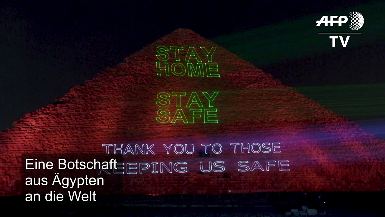 Mit einer Lichtprojektion an der Großen Pyramide von Gizeh wird in Ägypten die Einhaltung der Ausgangsbeschränkungen angemahnt.