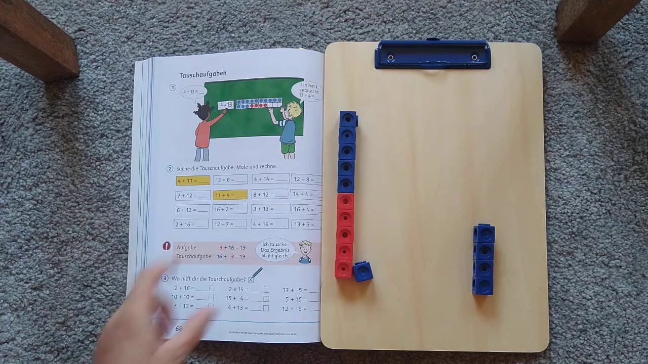 Für eine 1. Klasse einer Berliner Grundschule wird hier mit Hilfe des Lehrwerks Jo-Jo (Seite 68) das Prinzip der Tauschaufgaben im Zahlenraum bis 20 erläutert. Das Video entstand während des Corona-Lockdowns.