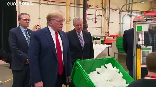 Eine durchsichtige Schutzbrille hat US-Präsident #Trump in der Maskenfabrik in Phoenix aufgesetzt, aber trotz Hinweisschildern keine Maske. View on euronews</a>