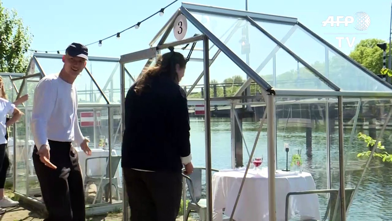 Essensgenuss der etwas anderen Art in Corona-Zeiten: Im Kunstzentrum Mediamatic in Amsterdam nehmen die Gäste in virensicheren, voneinander abgetrennten Mini-Gewächshäusern Platz.