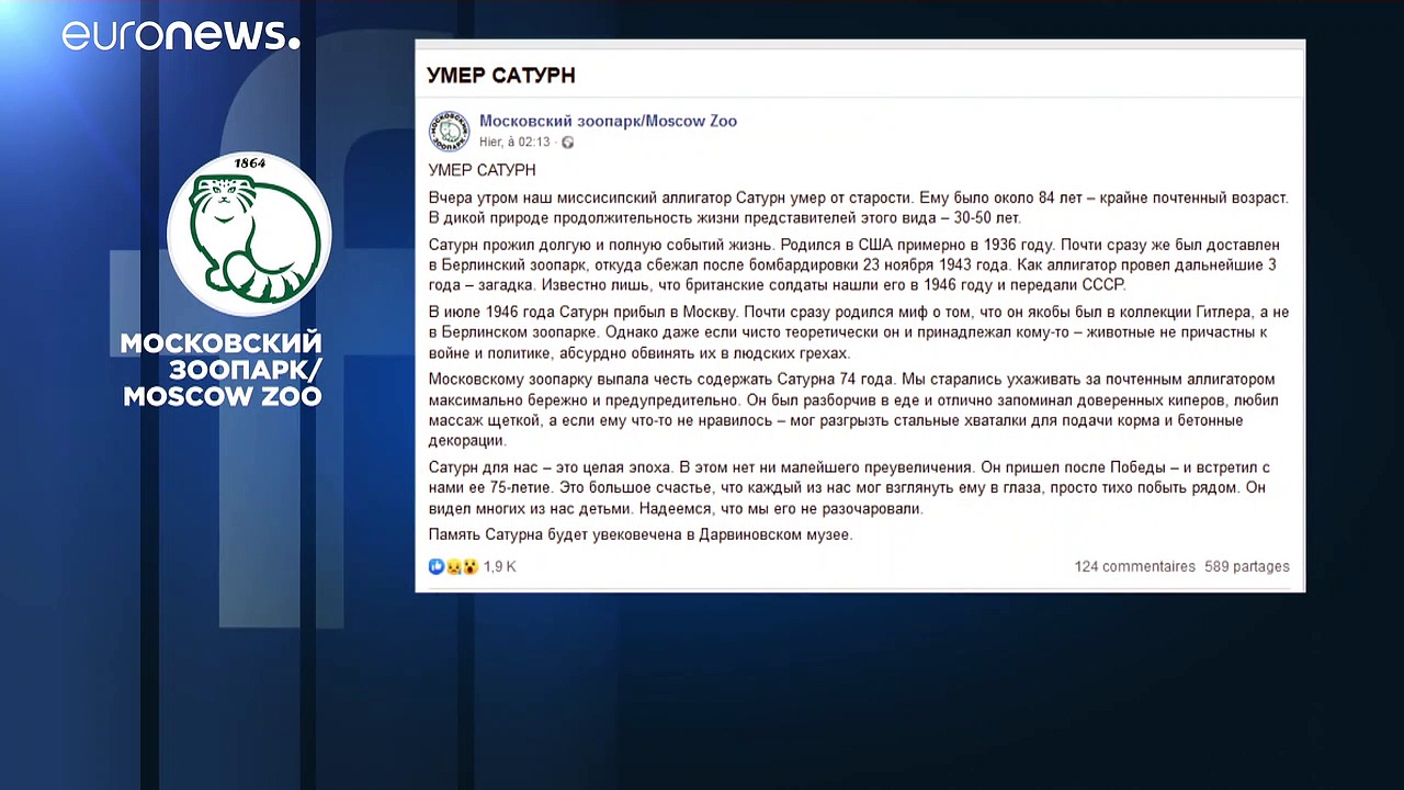 Saturn, der jetzt 84 jährig in Moskau friedlich verstarb, war Beute: Kriegsbeute. Seit 1936 lebte er im Berliner Zoo, in den Kriegswirren gelang ihm 1943 die Flucht, 1945 erst fassten ihn britische Soldaten, die ihn an die Russen überstellten. View on euronews</a>