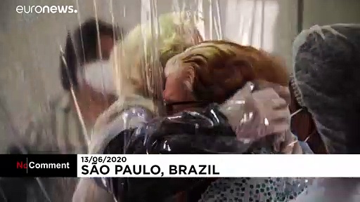 Ältere Patienten in einem Pflegeheim in Sao Paulo können ihre Angehörigen virensicher durch einen Plastikvorhang umarmen. Der Geschäftsmann Bruno Zani nimmt in Anspruch, den "Hug Curtain" erfunden zu habenView on euronews</a>