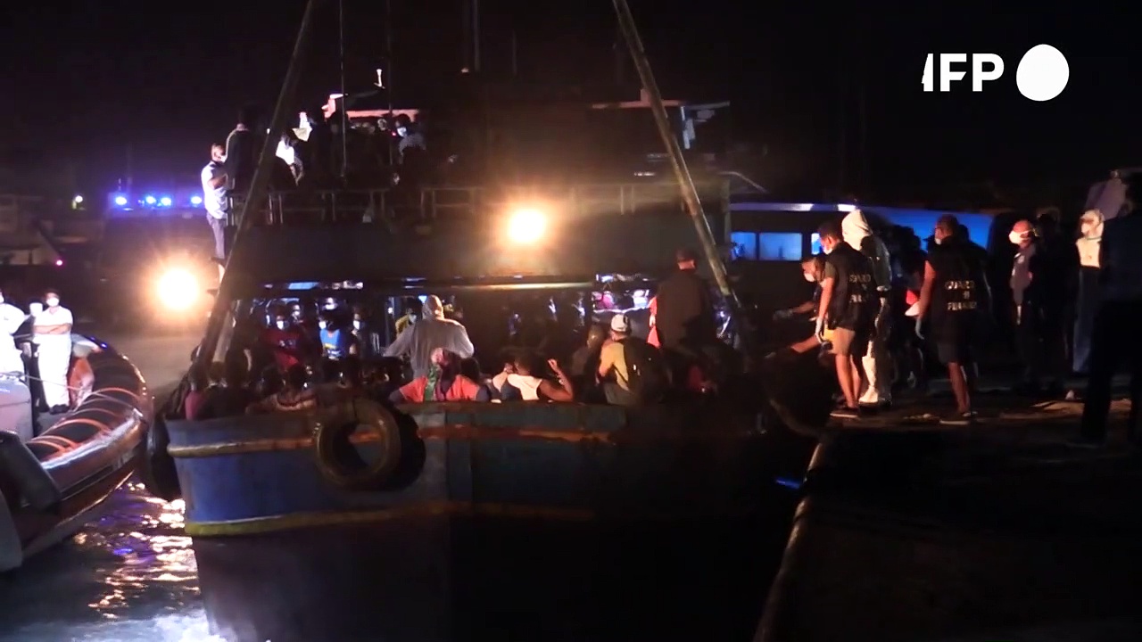 Etwa 450 Migranten an Bord eines seeuntauglichen Fischerboots haben in der die süditalienische Insel Lampedusa erreicht. Das in Seenot geratene alte Boot wurde von der italienischen Küstenwache und Polizei zum Hafen von Lampedusa eskortiert.