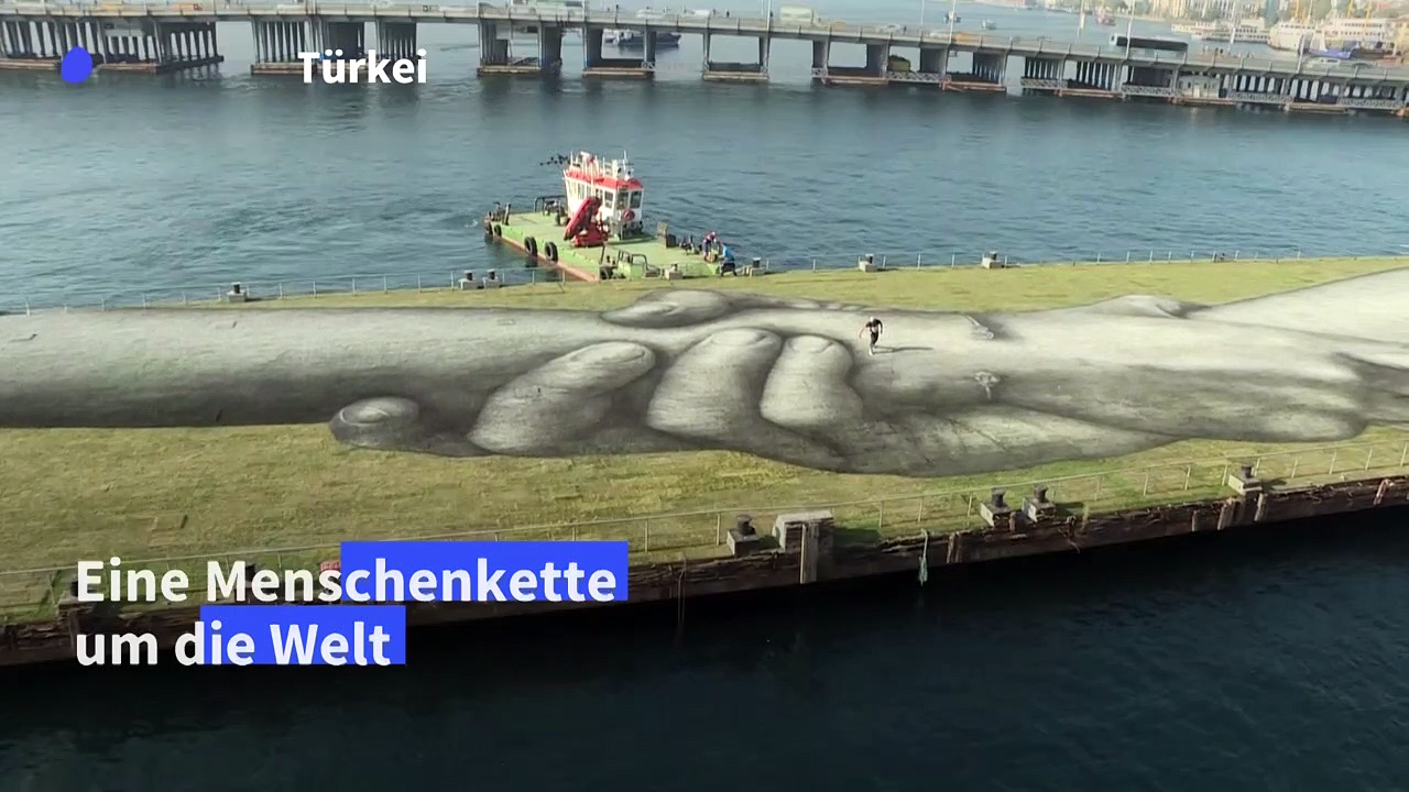 Zwei riesige verschlungene Hände, die auf dem Bosporus schwimmen: Der Künstler Saype hat in Istanbul sein neues Werk vorgestellt. Sein Ziel ist es, mit seinen Bildern eine Menschenkette um die Welt zu bilden.