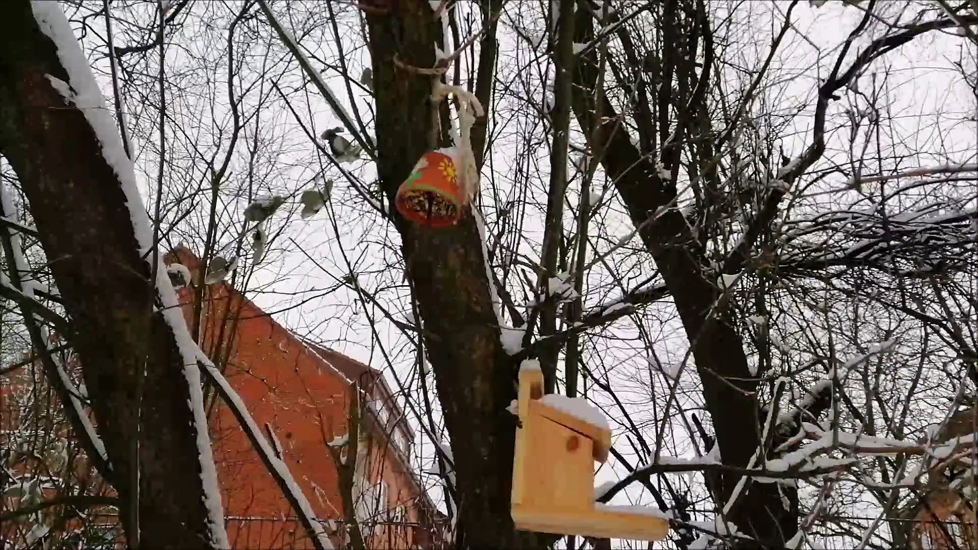 Hier sind einige Vögel bei der Futtersuche im Winter zu beobachten.