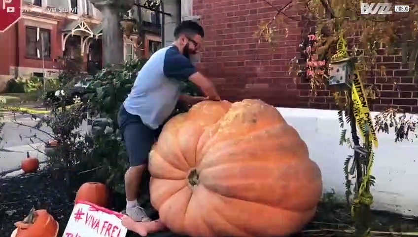 Mit einer Kettensäge schnitzte dieser Vater einen 500-kg-Kürbis für seine Kinder. Die Familie hat Spaß auf der Straße in Montreal, Kanada.