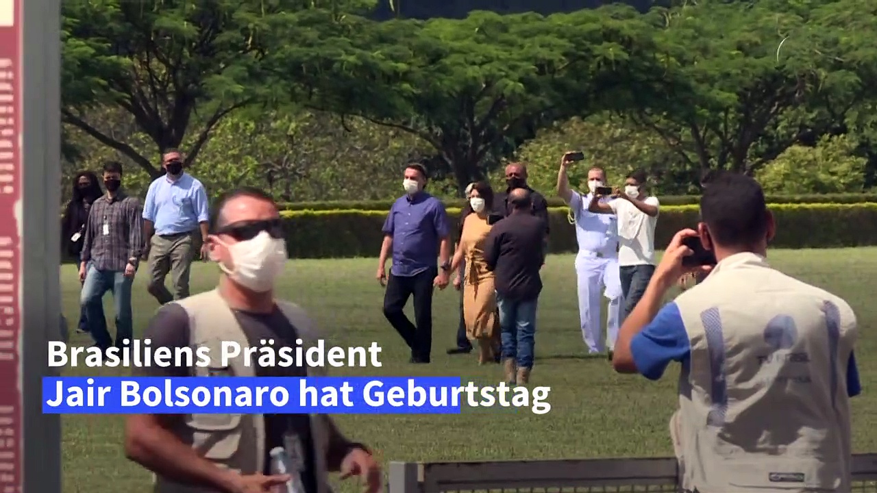 Brasiliens Präsident Jair Bolsonaro hat Geburtstag und lässt sich von Anhängern vor seinem Wohnsitz feiern. Der rechtsextreme Staatschef bedankt sich bei seinen Unterstützern und zeigt sich dabei ganz ungewohnt mit Maske.