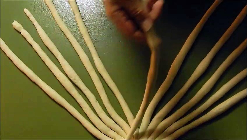 Herstellung eines 12 - Strang Zopfes ( Kann aus Zopfteig oder Brotteig hergestellt werden).<br /><br />Rezept:<br />1020 gr. Halbweissmehl<br />600 gr. Wasser<br />20 gr. Hefe<br />12 gr. Salz<br />Alles zu einem Teig kneten.<br />12 Stränge à ca. 138 gr. Teig gleichmässig ausrollen.<br />Zopf flechten.<br />Ca. 50 Min. an warmem Ort aufgehen lassen.<br />Mit Mehl bestäuben. <br />Wenn beim Eindrücken mit dem Finger Delle bleibt, Zopf bei 250 Grad in den Ofen einschiessen. Nach 10 bis 20 Min. Temperatur zurück auf etwa 220 Grad.<br />Backzeit ca. 40 bis 50 Min.<br />Brot auf Gitter auskühlen lassen.