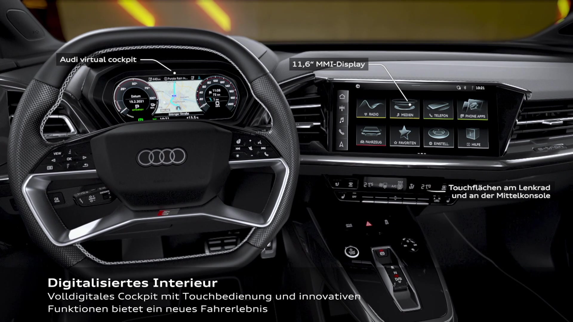 Die neue Technikära, in die Audi gestartet ist, wird auch im Innenraum des Q4 e-tron und des Q4 Sportback e-tron erlebbar. Die Instrumententafel präsentiert sich in progressiver Eleganz, sie unterstreicht das luftige Raumgefühl. Das Cockpit ist betont dreidimensional gestaltet, seine geometrischen Volumina stehen in spannungsvollen Bezügen zueinander.<br /><br />In den beiden Elektro-SUVs übernehmen die Bedien- und Anzeigeeinheiten mehr denn je auch die Funktion von Designelementen. Das digitale Instrument für den Fahrenden ist wie ein Diamant zwischen zwei Volumina eingebettet – einem kurzen auf der linken Seite, das einen Luftausströmer einschließt, und einem langen auf der rechten Seite. Es reicht bis zur Beifahrertür und integriert weitere Luftdüsen. Vor ihm ist, clean und leicht wirkend, das zentrale MMI touch-Display platziert. Es ist zum Fahrenden hin geneigt und ergonomisch gut erreichbar.<br /><br />Eine schlanke Dekoreinlage, der sogenannte Tech Layer, liegt oberhalb des Displays und verbindet es mit der Instrumententafel. Für die Oberfläche dieser Blende stehen Materialien wie offenporiges Lindenholz, Aluminium in zwei verschiedenen Ausführungen und Kunststoff zur Wahl. Alternativ ist die Dekoreinlage im Interieur S line kurz nach dem Marktstart auch mit einem neuartigen, anthrazitfarbenen Technikgewebe erhältlich, das teilweise aus Rezyklatmaterial besteht.