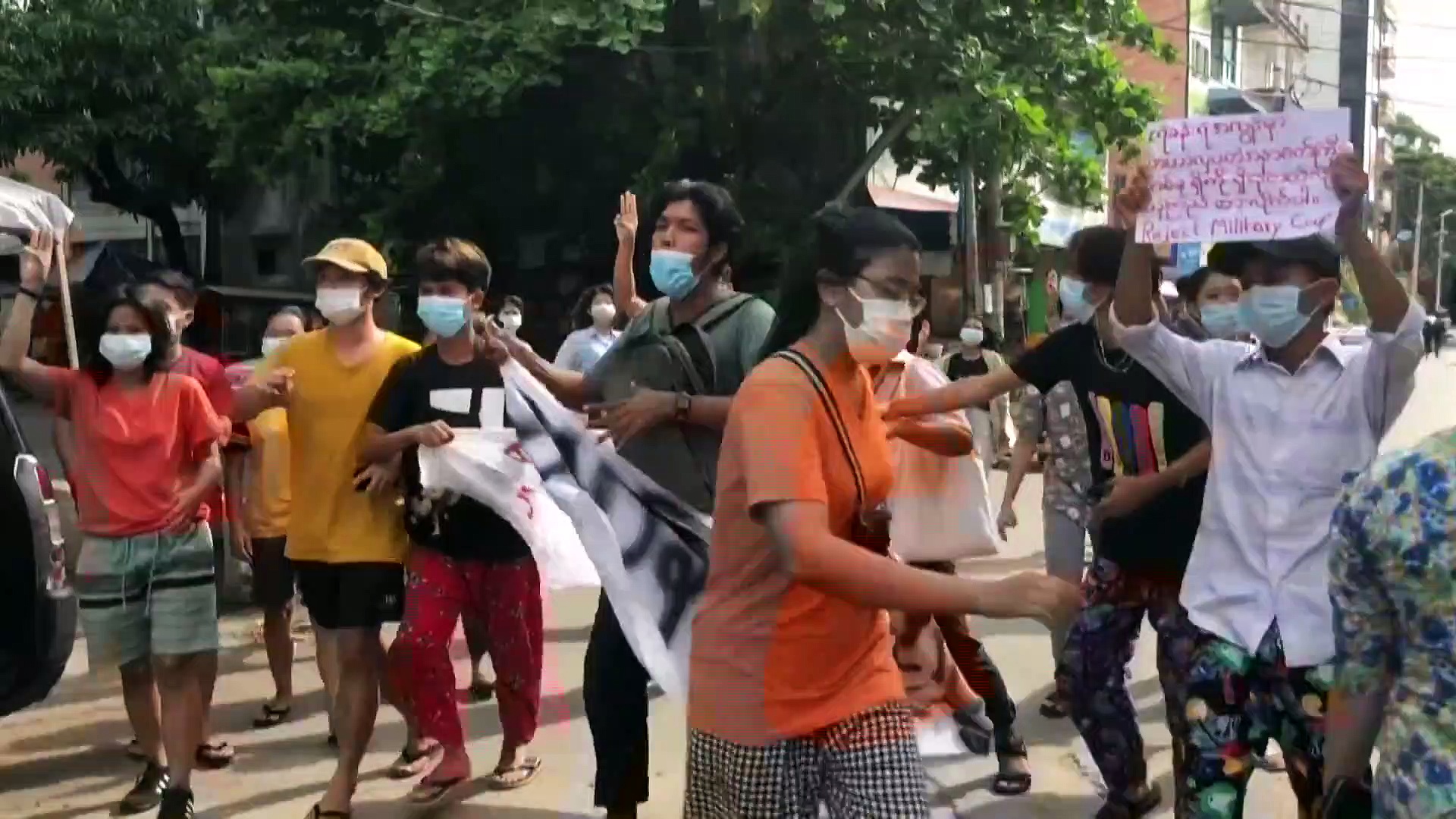 Dutzende Demonstrant:Innen ziehen zügig durch die Strassen von Myanmars grösster Statdt Yangon, der ehemaligen Hauptstadt Rangoon. Die Menge zeigte Transparente und skandierte Slogans wie "Wir wollen Demokratie".