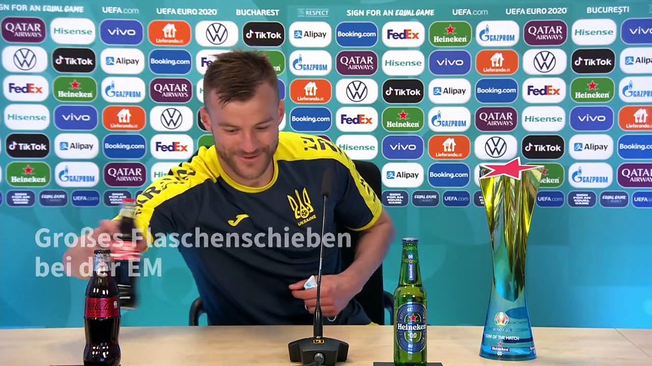 Der ukrainische Fußball-Nationalspieler Andrej Jarmolenko hat sich nach dem 2:1 gegen Nordmazedonien einen Scherz mit den Flaschen der Sponsoren Coca-Cola und Heineken erlaubt. In den Tagen zuvor hatte Portugals Superstar Cristiano Ronaldo die Cola-Flaschen aus dem Bild gerückt und empfohlen, stattdessen Wasser zu trinken.