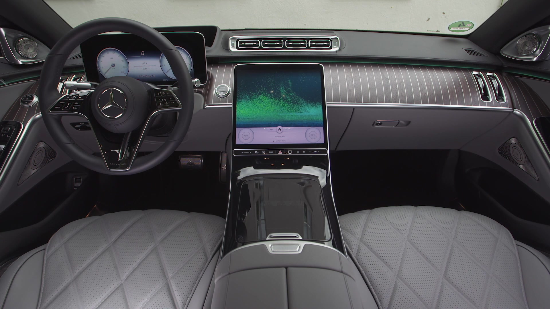 Der Innenraum der Mercedes-Maybach S-Klasse baut auf der komplett neuen Interieurgestaltung der Mercedes-Benz S-Klasse auf. Instrumententafel, Mittelkonsole und Armauflagen bilden eine skulpturale Einheit, diese scheint über einer weitläufigen Landschaft zu schweben.<br /><br />Bis zu fünf Bildschirme sind erhältlich. Serienmäßig an Bord ist ein 12,8 Zoll großes OLED-Zentral-Display als Hightech-Kommandozentrale. Auf Wunsch gibt es ein 12,3 Zoll großes 3D Fahrer-Display mit dreidimensionaler Darstellung anderer Verkehrsteilnehmer und markanten Tiefen- und Schatteneffekten.<br /><br />Die besondere Optik des Fahrer-Displays im Anzeigemodus Exklusiv untermauert die Sonderstellung des Mercedes-Maybach. Die Einfassung der Rundinstrumente trägt die markentypische Farbe Rosegold.<br /><br />Diese Farbe kommt auch bei der Aktiven Ambientebeleuchtung (Sonderausstattung) zum Einsatz, also beim animierten LED-Lauflicht mit intelligenten Komfort- und Sicherheitsfunktionen. Mit Rosegold white und Amethyst glow umfasst die Aktive Ambientebeleuchtung zwei neue Farbwelten. Die „Welcome Fond“-Vorinszenierung begrüßt die Passagiere mit einer besonderen Lichtinszenierung. Ihre Premiere im Mercedes-Maybach hat die adaptive Fondbeleuchtung. In mehrfacher Hinsicht passt sie sich den Wünschen der Insassen an: Neben der Helligkeit lassen sich auch die Größe und Position des Lichtspots einstellen, auch die Lichtfarbe (warm/kalt) ist wählbar. Zugleich ist eine breite Spreizung zwischen präzisem Arbeits- und entspanntem Loungelicht möglich.