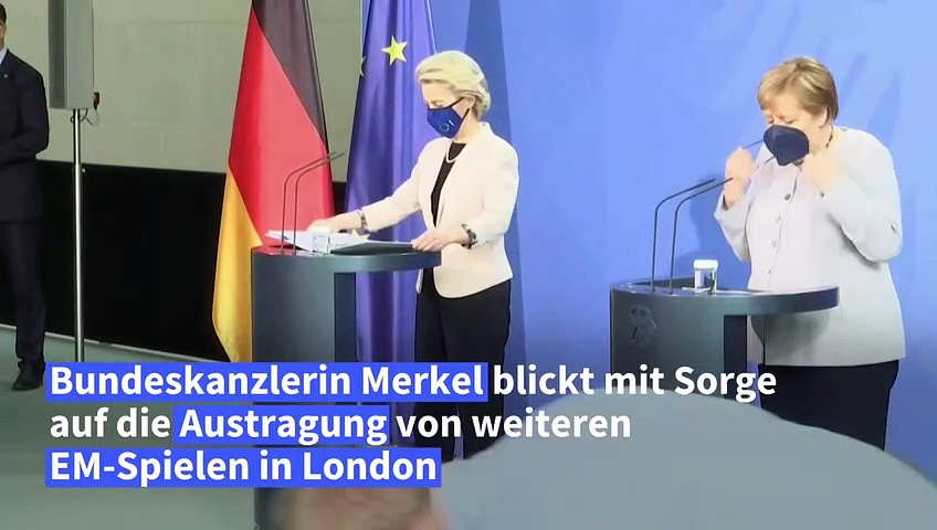 Angela Merkel blickt mit Sorge auf die Austragung mehrerer EM-Endrundenspiele in London. Großbritannien sei Virusvariantengebiet und sie hoffe, die UEFA werde verantwortungsvoll handeln, sagte die Bundeskanzlerin bei einer Pressekonferenz in Berlin.