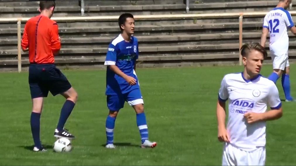 Im Testspiel gegen Tasmania Berlin schießt Mudai Watanabe (FC Stahl Brandenburg) mit diesem Distanzknaller sein Team noch vor der Halbzeit mit 2:0 in Front.