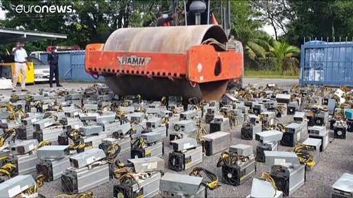 In Malaysia hat die Polizei auf einem Parkplatz mit der Dampfwalze mehr als 1.000 Computer plattgemacht - das Video wurde zum Hit in den sozialen Medien.