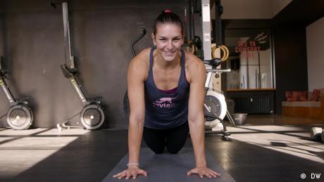 Fitnesstrainerin Aurelia zeigt eine Übung für den ganzen Körper.