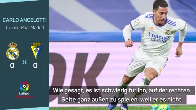 Eden Hazard spielte bei Real Madrids 0:0 gegen Cadiz nach 757 Tagen wieder eine Partie über 90 Minuten. Trainer Carlo Ancelotti lobte ihn danach und verriet, dass er weiter mit ihm plant.