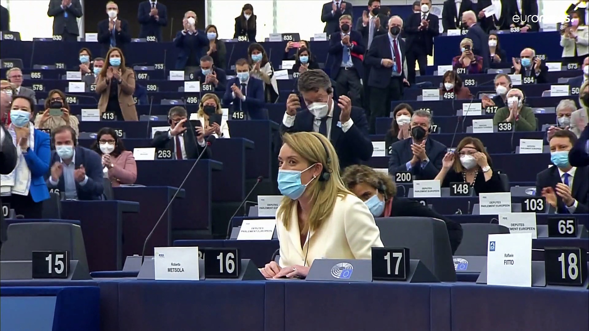 Roberta Metsola (EVP) im 1. Wahlgang mit 458 Stimmen zur neuen Präsidentin des Europaparlamentes gewählt.<br />