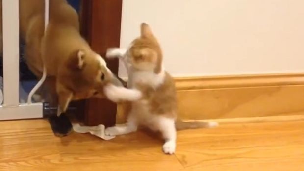 Diese Katze und dieser Hund sind richtige kleine Lümmel. Sie wissen, wie man im Team arbeitet.
