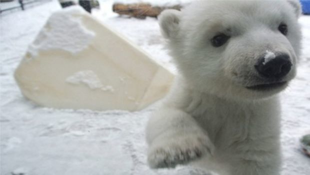 Ein Eisbär sieht zum ersten Mal Schnee
