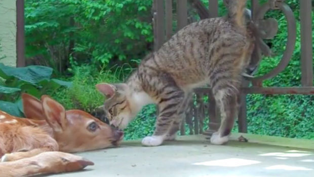 Ein unglaublicher Moment voller Zärtlichkeit zwischen einem Reh und einer Katze.