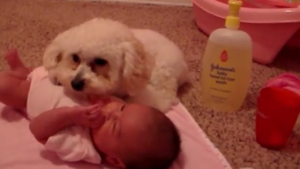 Dieser Hund verhält sich wie ein echtes Kindermädchen für das Baby. Dieser Beschützer ist einfach liebenswert!