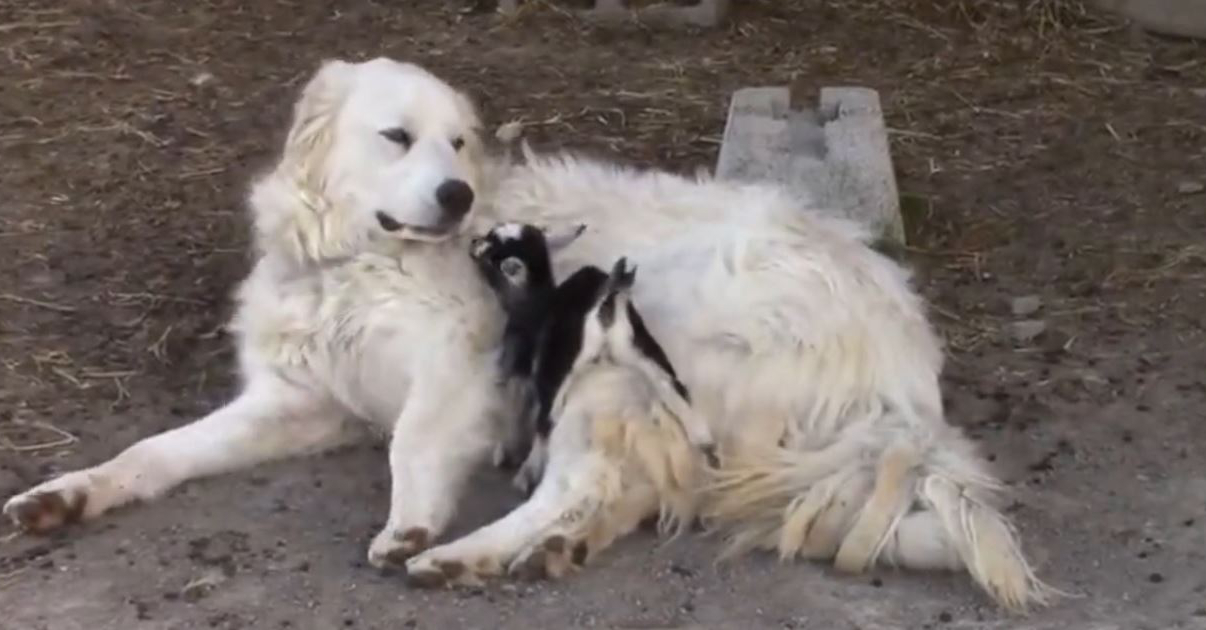 Ein großer Hund adoptiert ein kleines Zicklein.