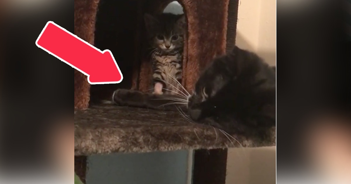 Dieses Kätzchen trifft zum ersten Mal dieses Baby. Die Reaktion der Katze ist sehr berührend.