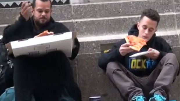 Ein Polizist fotografiert einen Jugendlichen, der den Fuß eines Obdachlosen hält und für ihn betet