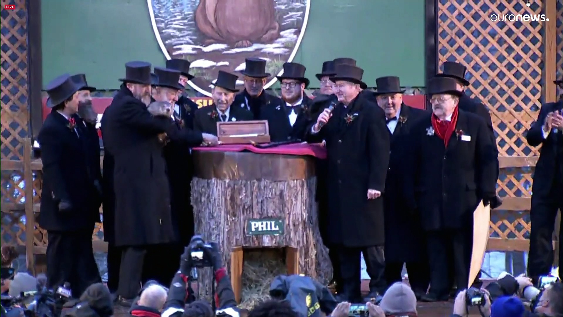 Beim traditionellen Groundhog Day 2021 in Punxsutawney im US-Bundesstaat Pennsylvania warteten Hunderte Schaulustige gespannt auf die Wettervorhersage von Murmeltier Phil.