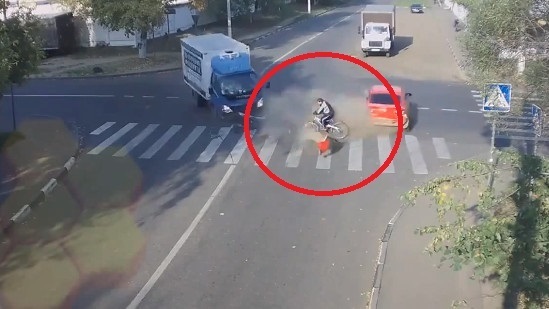Ein außer Kontrolle geratenes Auto zerstört ein Zweirad in einer Szene wie aus einem Actionfilm