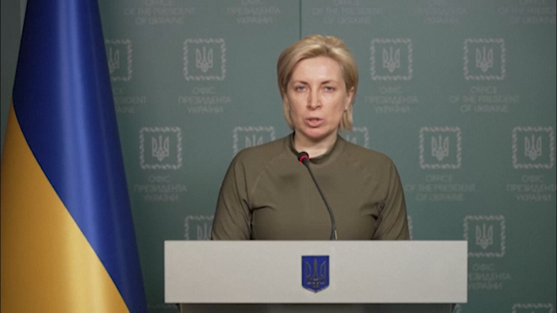 Die stellvertretende Ministerpräsidentin der Ukraine Iryna Wereschtschuk erläutert die humanitären Korridore für die Flucht von Zivilisten.<br />Mehr dazu im Ticker: https://www.derstandard.at/jetzt/livebericht/2000133861843/selenskyj-verurteilt-nato-wegen-ablehnung-von-flugverbotszone?responsive=false<br />Foto: UKRAINIAN PRESIDENCY / AFP<br />