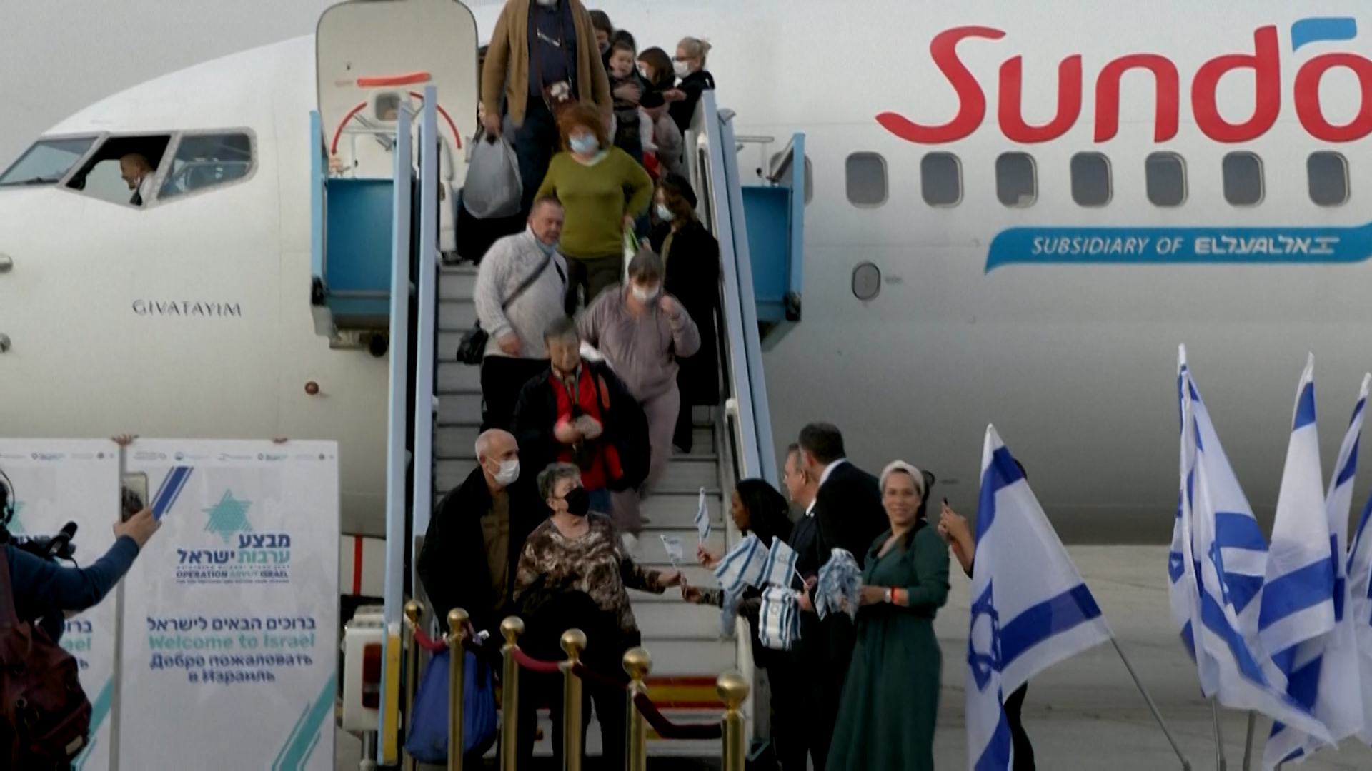 Israel bereitet sich darauf vor, insgesamt 100.000 Menschen aus dem Kriegsgebiet aufzunehmen. Am Sonntag wurden 300 jüdische Flüchtende in Israel empfangen<br /><br />Der Artikel zum Video: https://www.derstandard.at/2000133894145<br />Foto: AFP<br />