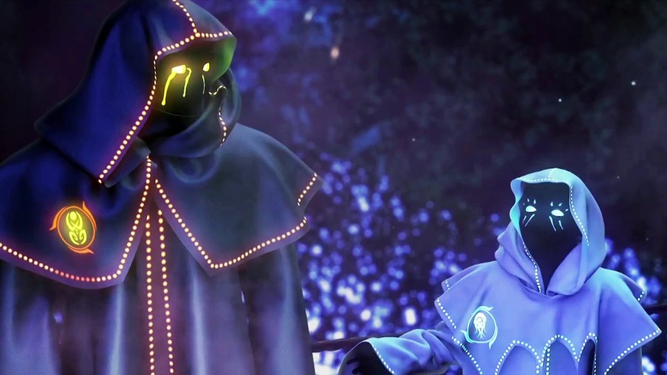 Der Ankündigungs-Trailer zu Nero zeigt zwei verhüllte Gestalten, die durch einen leuchtenden Wald wandern. Die größere Figur spricht währenddessen zu der anderen.
