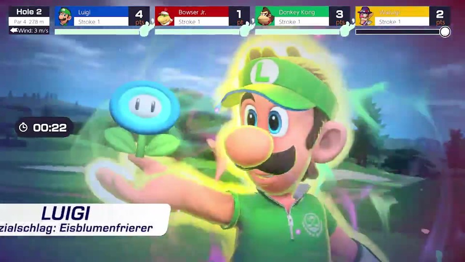 In Mario Golf: Super Rush gilt es, mit Charakteren aus dem Mario-Universum Golf zu spielen, also den Golfball mittels möglichst weniger Schläge ins Loch zu befördern. Jeder der 16 Charaktere hat dabei verschiedene Stärken und einzigartige Spezialtechniken. <br /> <br /> Im neuen Trailer werden die Spezialschläge und -Sprints der verschiedenen Charaktere vorgestellt: von Marios Superstern-Schlag zu Peaches Gymnastikband-Sprint. Die Spezialschläge laden sich über mehrere Runden auf und haben Einfluss auf das Spielfeld und die anderen Mitspieler*innen.