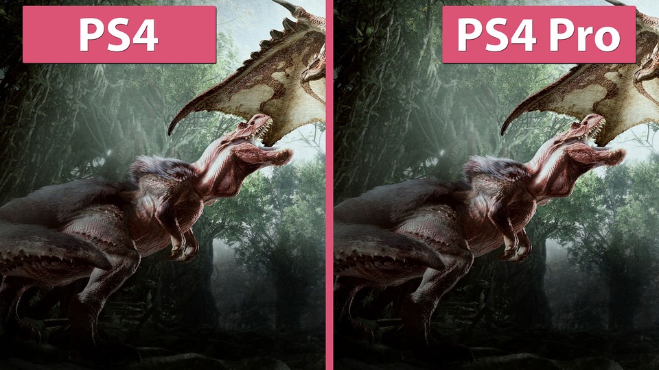 Monster Hunter World bietet drei unterschiedliche Modi für die PS4 Pro: Auflösung, Details und Bildrate (Performance). Diese haben wir in einem anderen Vergleich bereits näher betrachtet. Nun stellen wir die PS4 Pro Modi für Auflösung und Bildrate der Standard-PS4 gegenüber. <br /> <br /> Dieses Video gibt es in 4K UHD bei Candyland auf YouTube . <br /> <br /> Die PS4 Pro ist in beiden Modi der PS4 in Sachen Perfomance überlegen. Ihre Bildrate bleibt stets über 30 fps, bei der PS4 fällt sie selten auch mal darunter. Das ist nicht immer unbedingt ein Vorteil: Gerade bei den häufigen Schwankungen zwischen 30 und 35 fps im Modus für höhere Auflösung merkt man gelegentlich ein unruhiges Bild, weil durch diese Schwankungen der Zeitraum, bis der nächste Frame angezeigt wird, stark variiert. Ein Frame Lock auf 30 fps hätte zumindest in den Modi für höhere Auflösung und für höhere Details gut getan. <br /> <br /> Monster Hunter World im Test: Grandioser Monster-Grind <br /> <br /> Optisch steht die PS4-Version der PS4 Pro im Performance-Modus in nichts nach. Die Animationen wirken jedoch etwas altbacken, die Texturen könnten etwas schärfer sein. Zwar poppen hin und wieder Objekte auf, das wird aber nur bei Szenen mit sehr hoherer Sichtweite deutlich. Insgesamt hinterlässt Monster Hunter: World in Sachen Grafik einen positiven Eindruck. <br /> <br /> Hier geht es zu Candyland auf YouTube , Facebook und Twitter