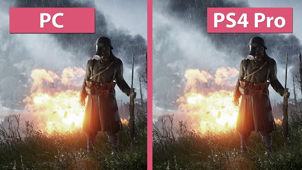 Das 4K-Duell: Wir spielen Battlefield 1 auf dem PC mit maximalen Grafik-Details bei 4K-Auflösung und vergleichen es zur PS4 Pro Version im 4K-Modus. <br /> <br /> Battlefield 1 schafft auf der PS4 Pro keine echten 2160p. Es läuft mit einer höheren dynamischen Auflösung als die PS4 – diese schwankt zwischen 1440p und 1656p – je nachdem wie anspruchsvoll die Szene gerade ist. Das Checkerboard-Rendering skaliert die Auflösung dann auf 2160p. Zwar sieht die PS4 Pro gegenüber der PS4 knackiger aus und überholt diese nicht nur bei der Auflösung, sondern auch bei Explosionen, Partikeln und Terrain – dennoch fallen zwischen der PC Version bei maximalen Detail Unterschiede auf. Besonders bei den Spiegelungen, Details und bei der Sichtweite hat der PC die Nase vorne. <br /> <br /> Die PS4 Pro Version zeigt dennoch eindrucksvoll, wie gut das Checkerboard-Rendering funktioniert . Sie ist in Sachen Schärfe sehr dicht am PC, wie vor allem in der Kantenglättungs-Szene deutlich wird. <br /> <br /> Im Video haben wir Szenen aus dem Einzel- und Mehrspieler-Modus aufgenommen. Das Video gibt es in 4K UHD bei Candyland auf YouTube . Hier geht es zu Candyland auf YouTube , Facebook und Twitter . <br /> <br />