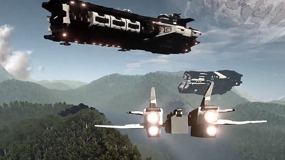 Im E3-Trailer zum Weltraum-Spiel Dual Universe geht es von der Planetenoberfläche direkt ins Weltall. Vorher wird das eigene Raumschiff gebaut. Im All sehen wir andere Schiffe und eine riesige Station bevor es aus einen anderen Planeten und direkt zu einer großen Stadt geht.