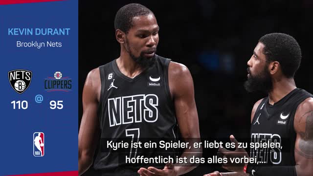 Nach dem 110:95-Sieg der Brooklyn Nets gegen die Los Angeles Clippers verrät Kevin Durant, dass sein Teamkollege Kyrie Irving gut gelaunt ist und er ihn zurück auf dem Spielfeld haben möchte.